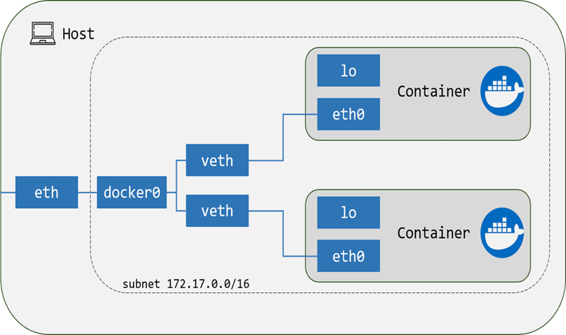 컨테이너 생성시 docker daemon에서는 veth(virtual eth) 가상 네트워크 인터페이스를 만들고 각 컨테이너의 eth0과 연결