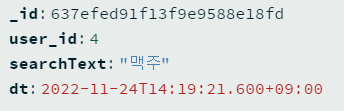 검색 히스토리에 대한 Schema는 '유저id', '검색단어', '검색 시간' 정도로 구성하였고, 다른 Table, Collection과의 관계가 없어, 독립적으로 저장되고 유지되는 것이 MSA의 취지에 맞다고 생각했다.