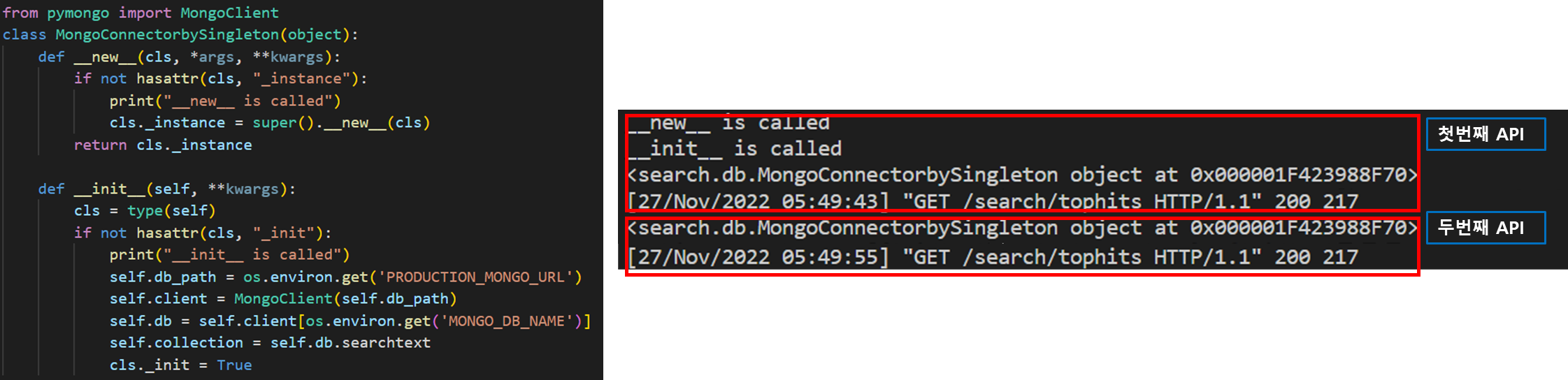 두번째 API 호출부터는 __new__ 메소드와 __init__ 메소드가 호출되지 않고, 인스턴스 값도 기존 인스턴스 값이 출력 되는 것을 알 수 있다.